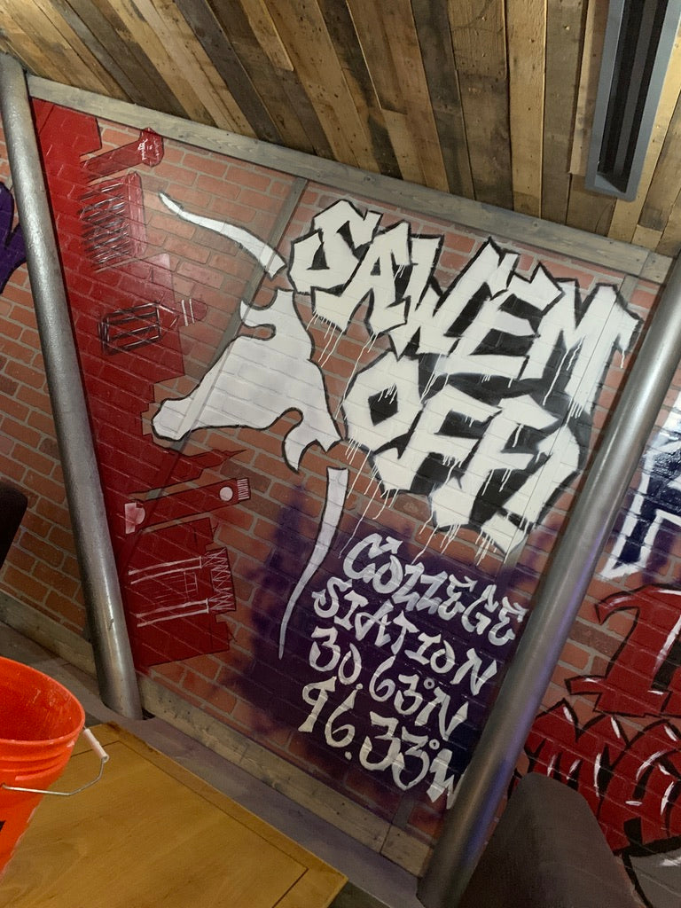 Saw 'Em Off! is encompassing of the long standing rivalry between Texas A&M and the University of Texas. Complemented with the College Station skyline and the latitude and longitude of the city. (Southerns Mural Main Room - Part 4 of 7 | Center-Left)